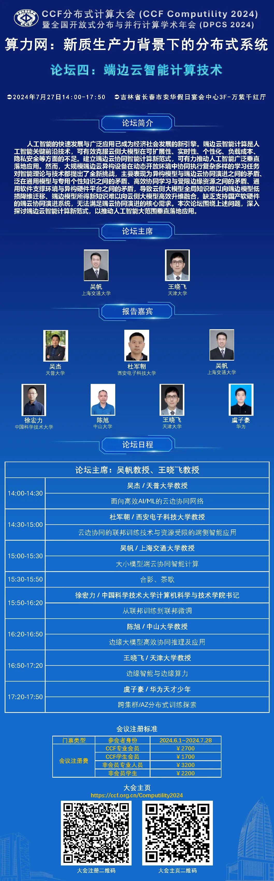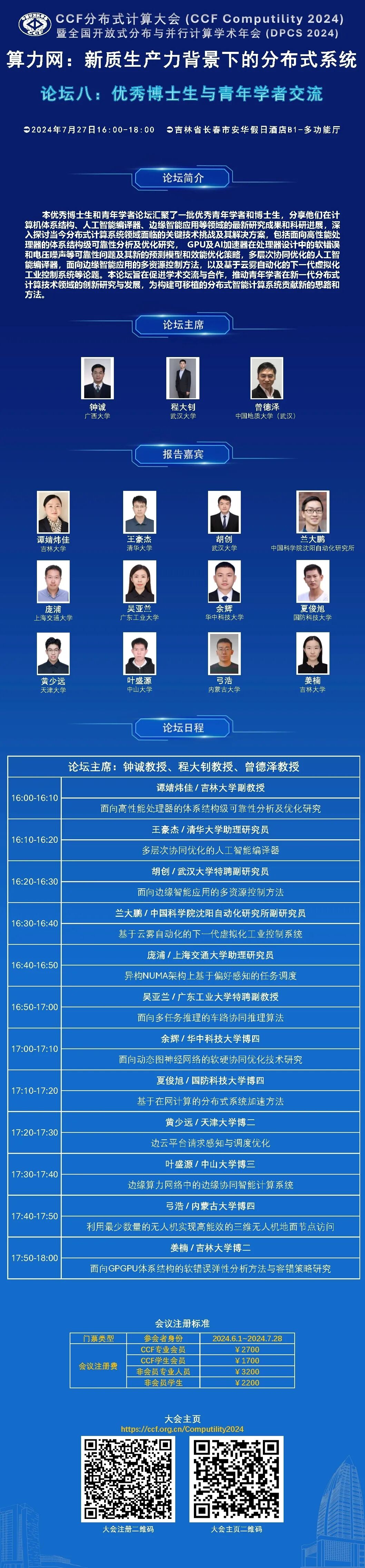 由CCF主办,CCF分布式计算与系统专委会与吉林大学承办的CCF分布式计算大会(CCF Computility 2024)暨全国开放式分布与并行计算学术年会(DPCS 2024)将于2024年7月26日至28日在中国吉林省长春市举行,会议规模预计1000余人。本次会议主题为“算力网:新质生产力背景下的分布式系统”,旨在为分布式系统和算力网相关的从业者提供最专业的学术研讨、技术交流和成果展示的平台。CCF Computility 2024为大家准备了11场由院士等顶级专家带来的主旨报告,15场技术论坛(80多位特邀报告),绝对不容错过!