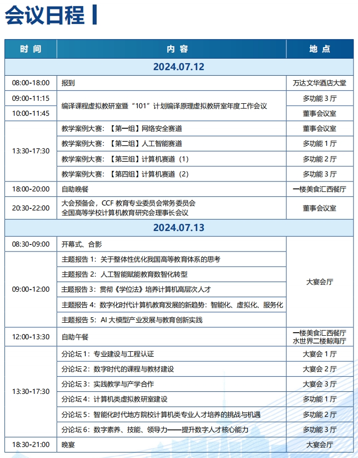 2024年中国高校计算机教育大会(CCEC2024)将于7月12-15日在哈尔滨万达文华酒店召开,倒计时2天时间,大会全日程一览、参会须知请查收,请抓紧机会报名参会。