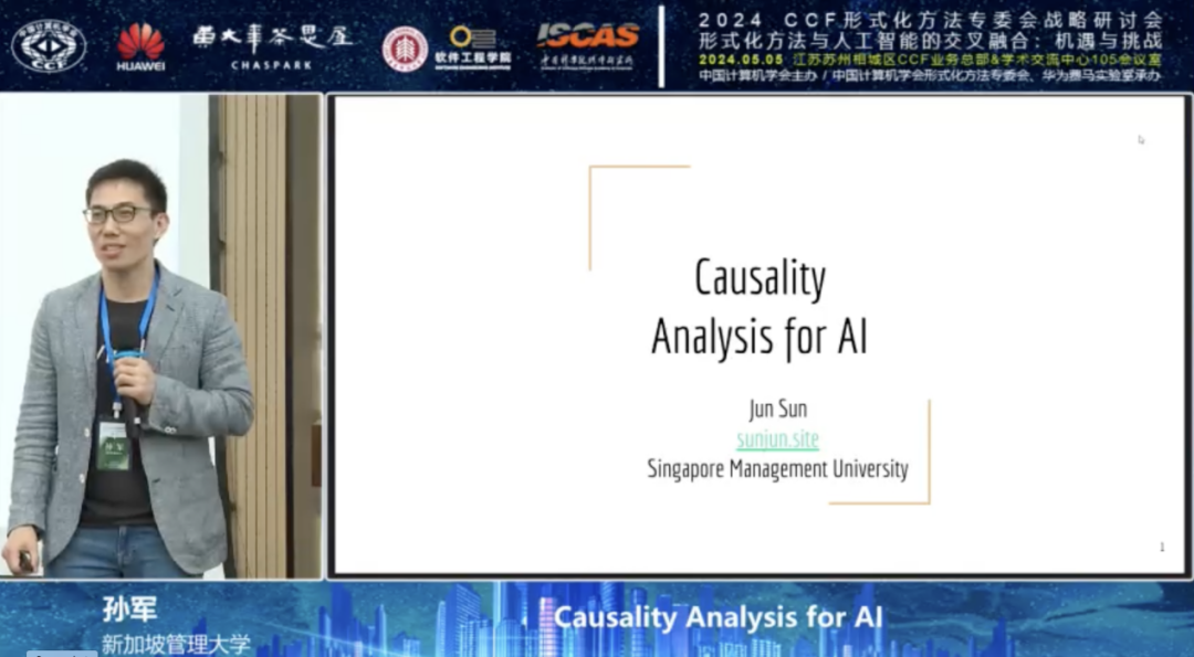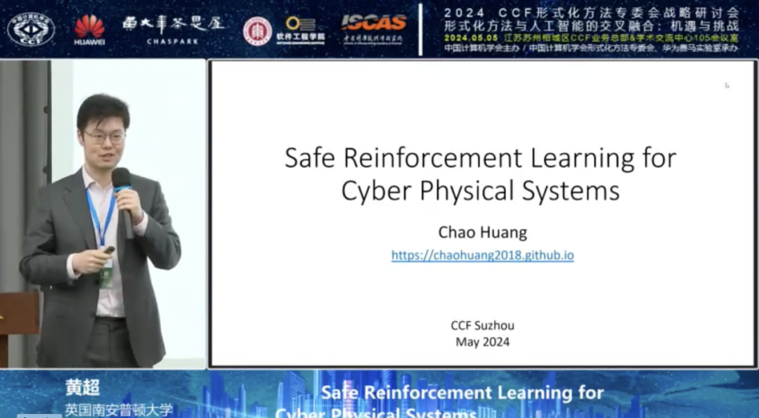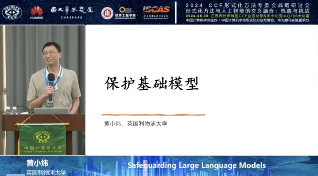 下午举行了“FM for AI”的Session和Panel,由来自华东师范大学的张民教授主持。该Session包括4个报告:首先来自北京大学的孙猛教授做了“深度神经网络的语义鲁棒性”的报告,然后来自英国利物浦大学的黄小炜教授做了“Safeguarding Large Language Models”的报告,来自新加坡管理大学的孙军教授做了“Causality Analysis for AI”的报告。来自英国南安普顿大学的黄超教授做了“Safe Reinforcement Learning for Cyber Physical Systems”的报告。Panel环节除了报告人之外,还邀请了浙江大学的王竟亦研究员参加。Panel嘉宾对于“FM for AI”的相关问题进行了充分讨论与交流。