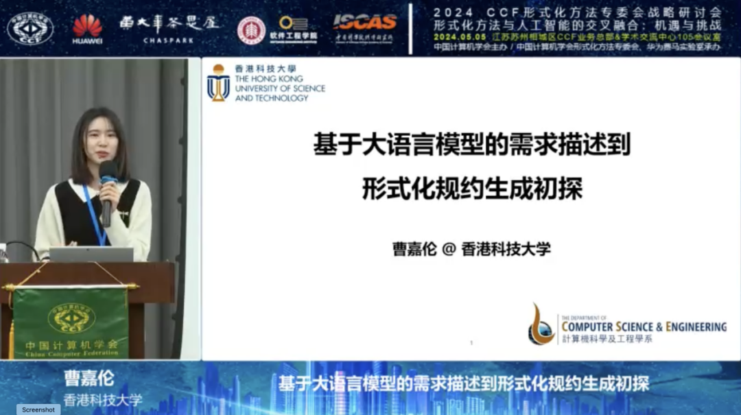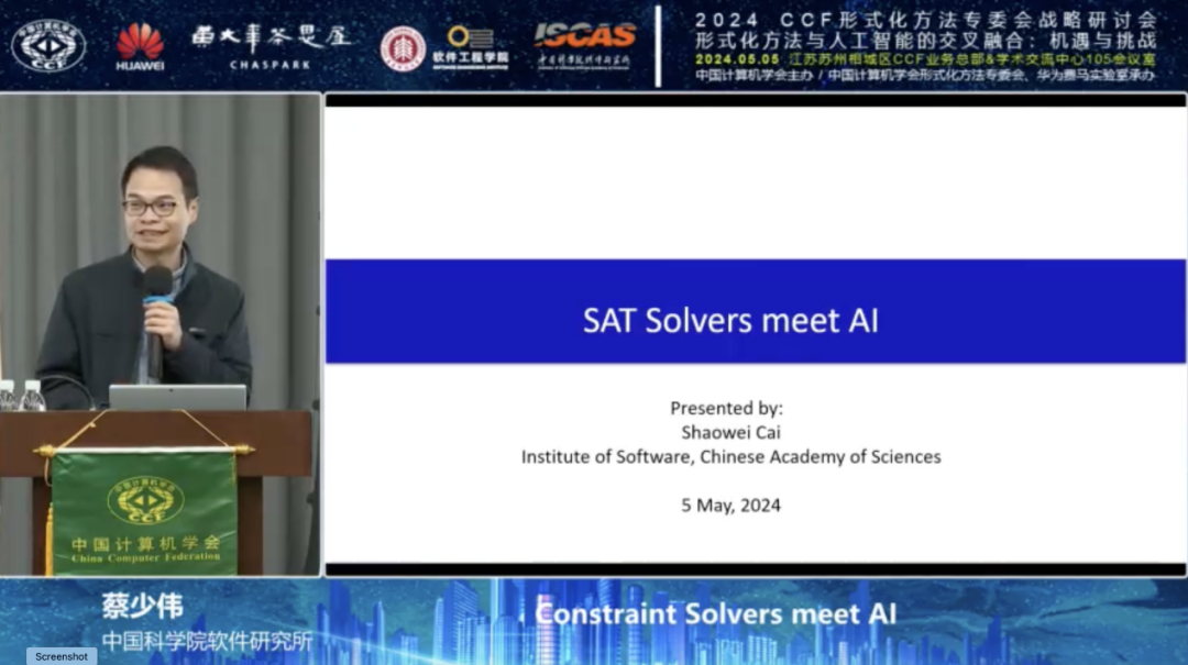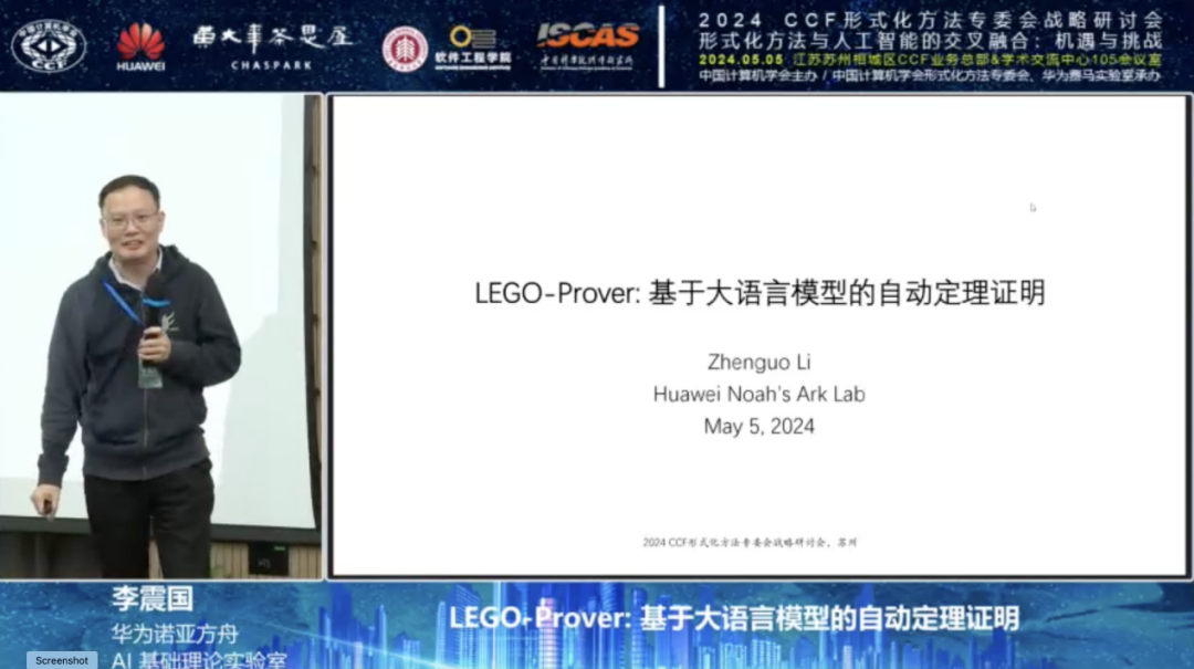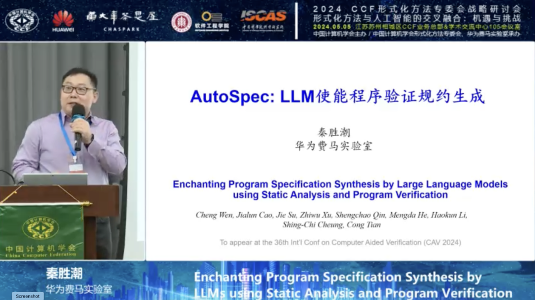 上午举行了“AI for FM”的Session和Panel,由来自上海交通大学的曹钦翔副教授主持。该Session包括5个报告:首先来自南京大学的李宣东老师做了“神经符号融合软件的可信理论与方法”的报告,然后来自华为费马实验室的秦胜潮老师做了“Enchanting Program Specification Synthesis by LLMs using Static Analysis and Program Verification”的报告,来自中国科学院软件研究所的蔡少伟老师做了“SAT Solvers meet AI”的报告,来自华为诺亚方舟 AI 基础理论实验室的李震国老师做了“LEGO-Prover: 基于大语言模型的自动定理证明”的报告,最后来自香港科技大学的曹嘉伦老师做了“基于大语言模型的需求描述到形式化规约生成初探”的报告。5位报告人从不同的角度分享了在“AI for FM”方面的一些思考和探索,并在Panel环节与听众进行了充分的互动和交流。