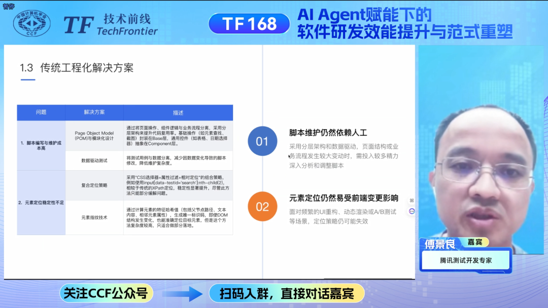 首先,傅景良讲解了案例的背景:随着大模型技术的突破,AIGC正为Web UI自动化测试带来全新变革。传统UI自动化测试依赖脚本开发,存在脚本维护成本高、元素定位不稳定等难题,不够智能高效。