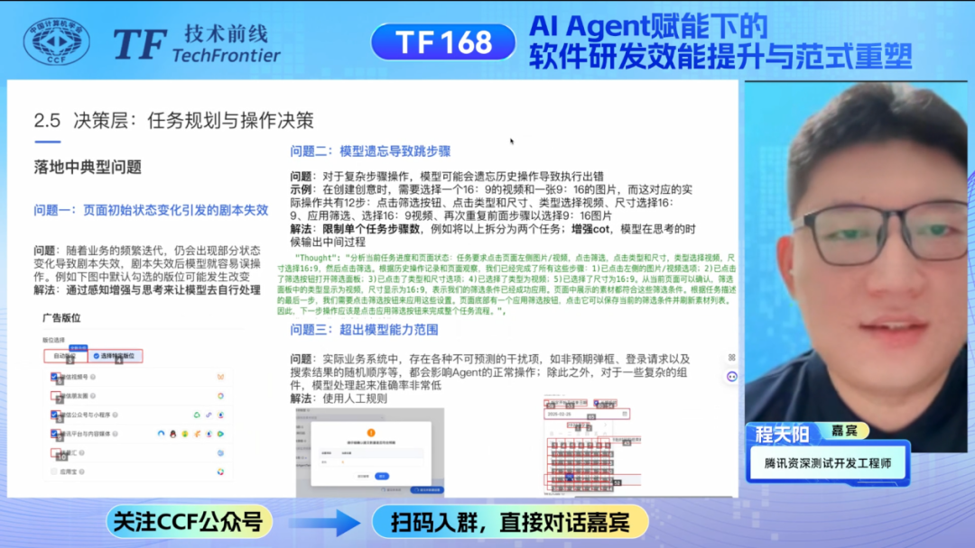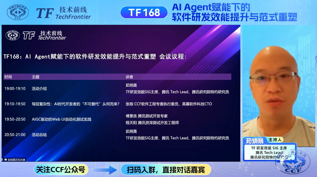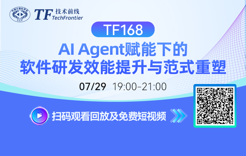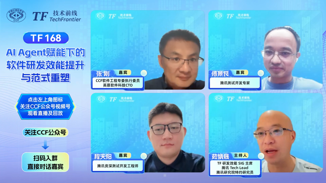 2025年7月29日,CCF TF迎来了第168期活动,主题为“AI Agent赋能下的软件研发效能提升与范式重塑”。本次活动由CCF TF研发效能SIG策划呈现,邀请到CCF软件工程专委执行委员及英慕软件科技CTO张刚、腾讯测试开发专家傅景良、腾讯资深测试开发工程师程天阳三位讲者。活动以线上直播的形式进行,吸引了众多专业人士的参与。本文将系统梳理本次活动的核心观点与技术洞察,呈现AI Agent深度赋能软件研发的最新发展趋势。