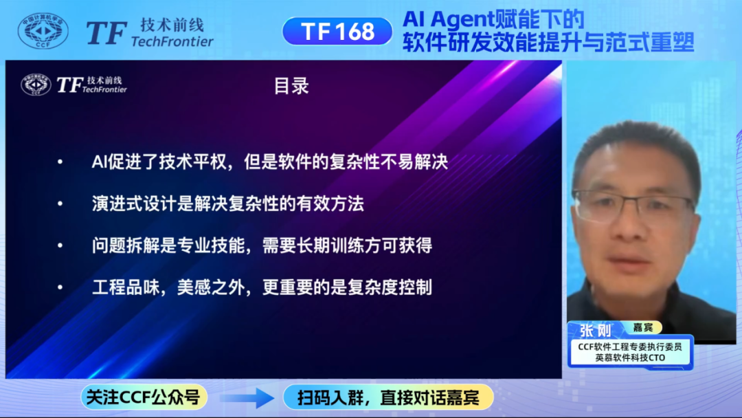 CCF软件工程专委执行委员、英慕软件科技CTO张刚以《驾驭复杂性:AI时代开发者的“不可替代”从何而来?》为题进行分享,结合实际案例探讨专业开发者如何以演进式设计思维,通过高质量的问题分解和设计质量把控,实现与AI的高效协作。