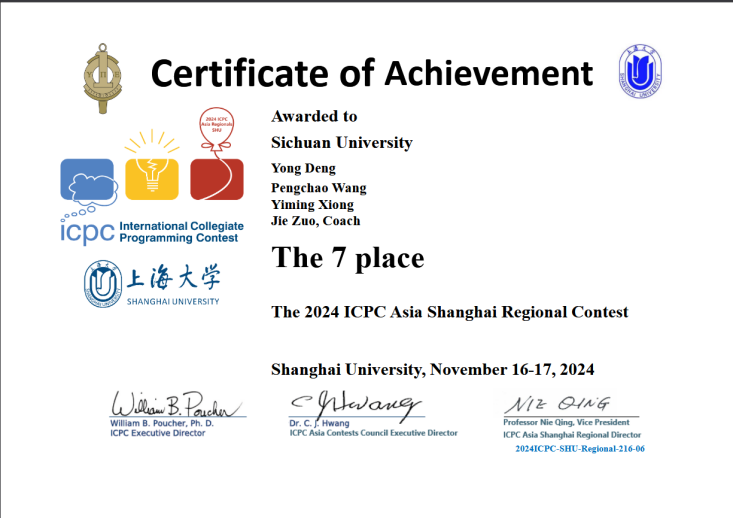 2024年ICPC上海站获奖证书,由于种种失误遗憾未能出线(获得参加World Finals的资格),获得了金奖第7名。