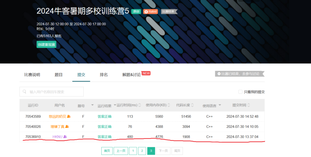 上述这三人中最年长的赵予唯选手(网名炸鸡块君)于2021年成功预推免至北京航空航天大学读硕,期间发表过NLP领域顶会论文,此后虽多次在大厂实习、获得offer,也申请过香港科技大学(广州)的博士研究生并拿到offer,但最终决定参与OI的教培工作,先后在北京市第四中学、清华大学附属中学实习并取得留用offer,以说话幽默风趣而闻名。赵予唯使用下图中的账号在国际性质的比赛牛客多校2024第五场中获得F题一血(最快解题奖)。