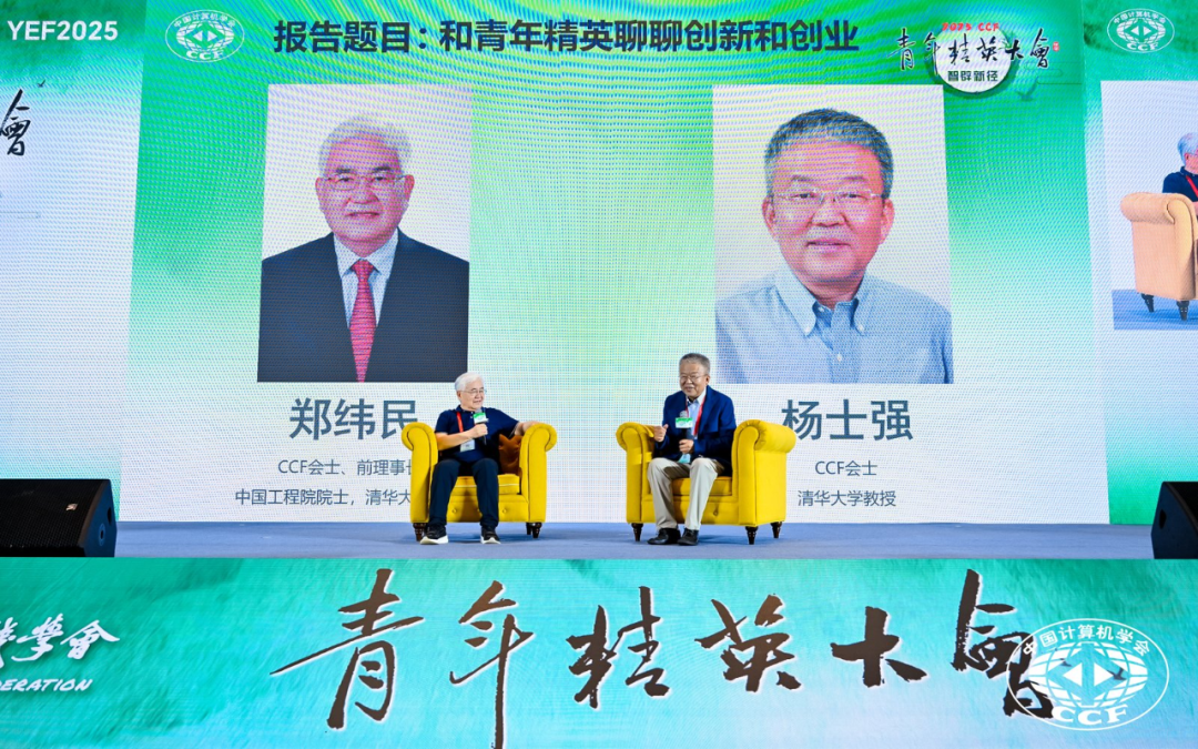 特邀报告由YEF2025组织委员会主席,CCF杰出会员、理事、YOCSEF秘书长,北京赛博英杰科技有限公司创始人、董事长谭晓生主持。今天的特邀报告涵盖青年创业洞察及具身智能产业化路径思考。首个环节“与青年精英聊聊创新和创业”,邀请到两位嘉宾:CCF会士、前理事长、中国工程院院士、清华大学教授郑纬民老师,以及计算机教育界标杆人物、在产学研融合中经验丰富且培养出大批杰出人才的杨士强老师,二人进行对谈。