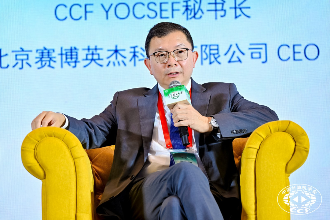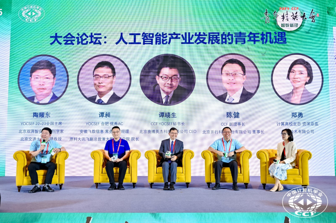 今日的大会论坛围绕《人工智能产业发展的青年机遇》这一主题展开讨论,由CCF杰出会员、理事,北京双湃智安科技有限公司首席科学家陶耀东主持,邀请CCF杰出会员、理事、YOCSEF秘书长,北京赛博英杰科技有限公司创始人、董事长谭晓生;CCF杰出会员、副理事长,北京并行科技股份有限公司董事长陈健;安徽飞数信息科技有限公司常务副总谭昶;计算高效生态资深总监,华为技术有限公司郑勇共同讨论。他们针对“人工智能产业发展的青年机遇和挑战”,从多方向进行探讨,助力我国人工智能的发展。