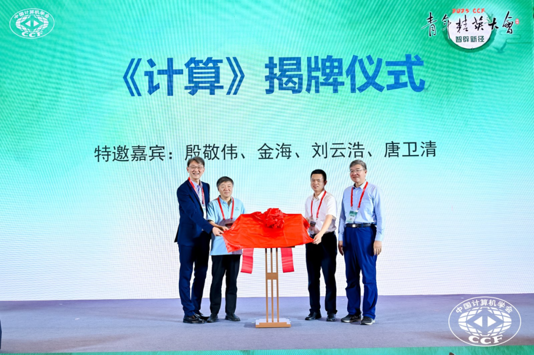 随后,在现场所有嘉宾的共同见证下举办了CCF会刊《计算》的创刊仪式。CCF名誉理事长、CCCF前主编李国杰院士;CCF理事长孙凝晖院士;哈尔滨工程大学党委常委、副校长殷敬伟教授致辞,祝贺《计算》杂志正式创刊。现场,殷敬伟副校长、金海副理事长、刘云浩主编、唐卫清秘书长,一起为《计算》创刊揭牌。创刊仪式由刘云浩主持。