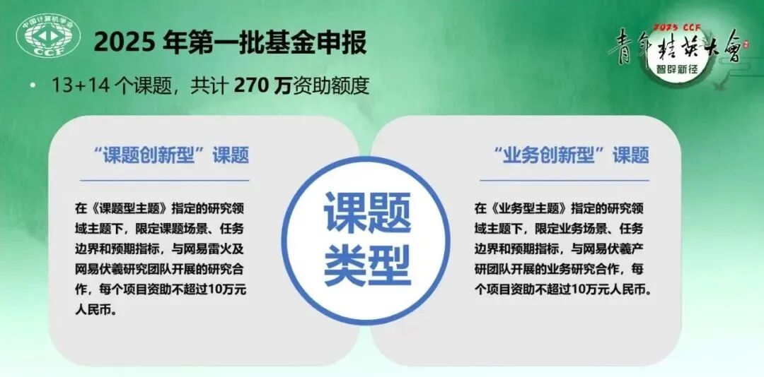 在论坛上,吴博士还特别介绍了2025CCF-网易雷火联合基金的申报情况,为了满足更多科研人员的申报需求,特别宣布:二期基金如下重点课题申报截止时间特别延长至2025年6月7日。