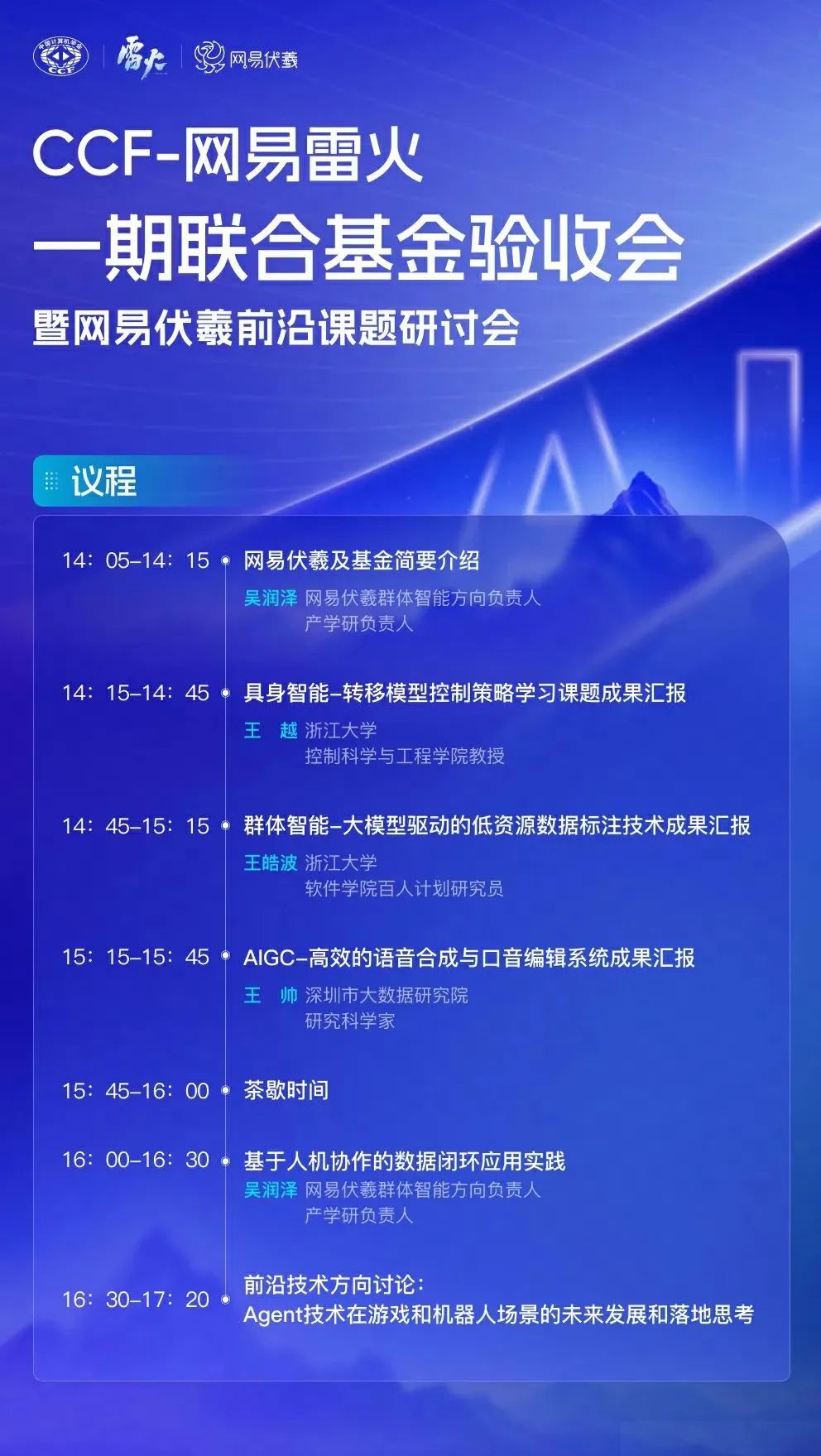 大会第一天,作为人工智能领域的领军企业,网易伏羲主办的“CCF-网易雷火一期联合基金验收会暨网易伏羲前沿课题研讨会”吸引了众多高校科研人员、企业技术专家及行业从业者关注和参与。