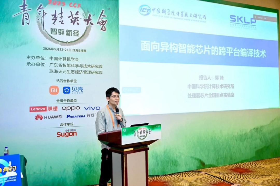 国家级青年人才、中国科学院计算技术研究所研究员郭崎则从智能芯片编译技术出发,提出跨平台编译优化的迫切需求。他指出,多架构、多工具链的生态碎片化限制了芯片效率释放。为解决这一问题,他提出从编译策略迁移、抽象接口构建等方面构建统一编程生态,实现“一套代码,多平台高效运行”。他还展示了低位宽矩阵计算、张量模型自动转移等关键技术成果。