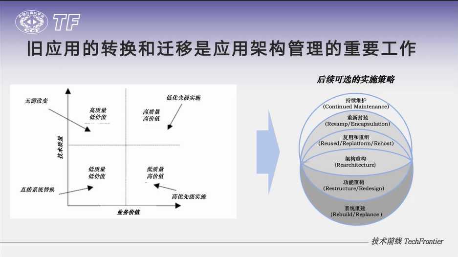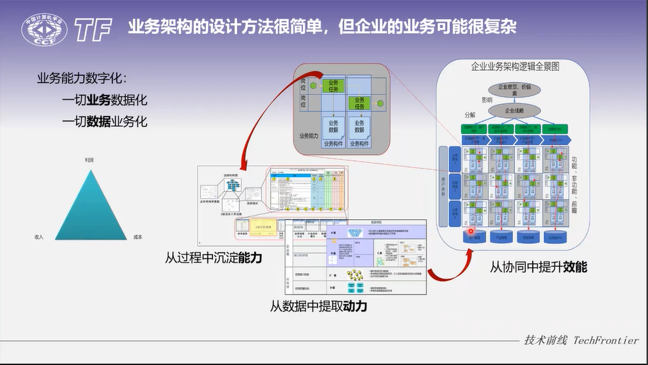 2024年6月6日,CCF TF迎来了第135期活动,主题为“企业架构引领数字化转型”。本次活动由CCF TF数字化转型与企业架构SIG策划呈现,邀请到三位行业专家作为讲者,分享他们在数字化转型和企业架构领域的深刻见解和实践经验。分享内容涵盖企业架构、业务架构、数据架构和应用架构等领域,全面梳理架构设计在数字化转型中的决定性作用。活动以线上直播的形式进行,通过腾讯会议平台和CCF视频号“中国计算机学会”同步直播,吸引了众多专业人士的参与。本文将回顾本次活动的精彩内容和深刻见解。 CCF TF CCF TF活动相关专家报告均收录在CCF数字图书馆【TF专辑】,欢迎长按识别,回看精彩分享。本期活动报告也将于近日收录,欢迎回顾! 《业务架构方法与发展新趋势》 来自北京天润聚粮咨询服务有限公司执行董事总经理付晓岩分享的主题是《业务架构方法与发展新趋势》,他详细介绍了业务架构的方法与发展新趋势,包括业务架构的定义、作用、设计方法等,强调业务架构是企业架构的核心,是连接业务与技术的桥梁,是解决企业IT治理、业技融合和整体转型问题的关键,强调了全局性结构化思维在数字化时代的必要性。他提出,数据作为新的生产要素,使得软件成为企业最重要的生产工具。在分享中,付晓岩提到:“业务架构是贯穿企业战略和IT实现的切入点,它包含‘产品、流程、实体’三种基础模型和‘领域、组件、对象’三个业务层次,通过‘五步方法论’来实现”,“业务架构设计的最终结果,它是一个业务能力的布局”,“从架构角度去看数字化应用实现的部分对业务架构的覆盖程度越大,你的数字化的实现就越好,或者说实现就越完整”这些洞见充分体现了业务架构在企业数字化转型中的核心地位。 《应用架构助力企业跨越数字化转型周期》 企业架构和应用架构领域专家王言以《应用架构助力企业跨越数字化转型周期》为题,回顾了企业数字化转型的发展历程,介绍了应用架构在企业数字化转型中的重要作用。通过类比城市规划和建筑发展,形象地阐述了应用架构在企业数字化转型中的重要性和复杂性。他提到了应用架构不仅仅是一套方法论,而是一个持续的过程,需要随着时间的推移不断地演进和优化。讲解了应用架构的核心关键能力,包括继承IT战略、与业务架构紧密关联、对向下的指导等。分享了应用架构跨越数字化转型周期的方法和策略,包括确定老应用是否需要迁移、采用不同的迁移策略等。王言特别强调了技术债务的管理,这是确保应用架构健康发展的关键,区分了技术债务的四个象限,以及对应的管理策略。 他提出:“企业架构的转型应当从应用架构的迁移改造开始,逐步偿还技术债,适应数字化转型的需求”。王言强调了应用架构在企业转型中的作用,通过不断优化应用架构,企业可以更好地支持数据的产生、存储、流转和合理的数据标准,进而推动数字经济的发展。他提到:“应用架构的工作是IT人士最基础的工作,它帮助我们逐步解决累积的问题,适应数字化转型的要求。” 《企业架构从应用优先到数据优先》 数字产业创新研究中心副主席,《精益数据方法论》作者史凯分享了《企业架构从应用优先到数据优先》,阐述了数据在企业软件应用过程中的四个阶段,以及数据如何成为业务的新型存在形式。强调企业正在走向九龙治水到数据驱动全局优化的过程,数据的重要性日益凸显。分享了大模型时代,传统架构模式正在坍塌,企业架构从应用优先走向数据优先。大模型和人工智能的发展将颠覆传统的数据价值链,企业需要适应这种变化,利用数据驱动业务增长和提升效率。 他提出“数据永生,应用快速迭代”,“数据已经成为了业务的存在形式”,“每个企业都会构建自己的数据资产蓝图和场景蓝图,数字化技术将聚焦于如何使用数据,企业将逐渐从人的驱动、流程的驱动转向数据的驱动”,“用全局的优化替代局部的优化”,这表明在数字化时代,数据作为新的生产要素,已经成为业务的核心载体。未来的企业将不再需要复杂的界面,而是通过数据和算法直接驱动业务流程。 在活动最后的问答环节中,TF数字化转型与企业架构SIG主席史海峰作为主持人,与三位讲者讨论了在线参会者提出的关于业务本质是不是数据、AI平台与架构的区别、企业架构实施的时机以及如何调动业务部门参与架构设计的积极性等问题。 史凯认为,随着数字化转型的深入,业务流程和数据流程已经成为了替代线下经验和人的业务承载主体,强调了数据在业务中的核心地位。 王言从AI平台和架构的角度出发,认为AI平台是基于AI大模型构建的,能够生成多种应用的平台,而AI架构则是未来可能基于大模型的新型应用架构,可能会与传统架构有较大区别。 付晓岩分享了在业务架构中调动业务部门积极性的挑战,强调了正向建模方法的重要性,以及如何通过企业战略和领导推动来促进业务部门的参与,对于企业架构实施的时机,他认为最本质的是系统的复杂度,而不是钱,通常系统数量达到三五十套以上时,就需要全局视图。 这些讨论为参与者提供了深入的见解和实用的建议,有助于推动企业架构和数字化转型的实践。最后几位讲者还为如何提高架构设计能力提供了建议。 本次活动为参会者提供了一个深入了解企业架构在数字化转型中作用的机会,三位讲者在分