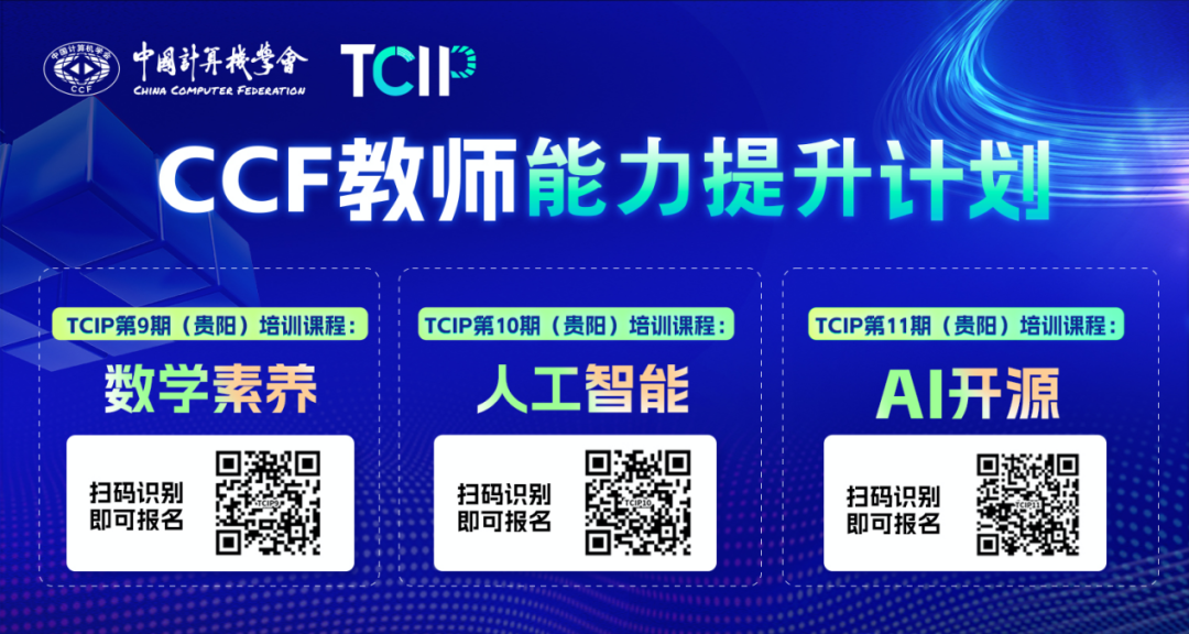 在人工智能重塑产业格局、数字中国建设纵深推进的时代背景下,中国计算机学会(CCF)与华东师范大学贵州(大数据应用)研究院,携手开启“TCIP教师能力提升计划”三期连开盛举!第9、10、11期分别分别聚焦“数字素养体系构建、人工智能教育创新、AI开源生态培育”,以“理论前沿化、实践场景化、培养体系化”为特色,为全国高校及职业院校教师打造贯穿技术、教学、产业的学习平台。